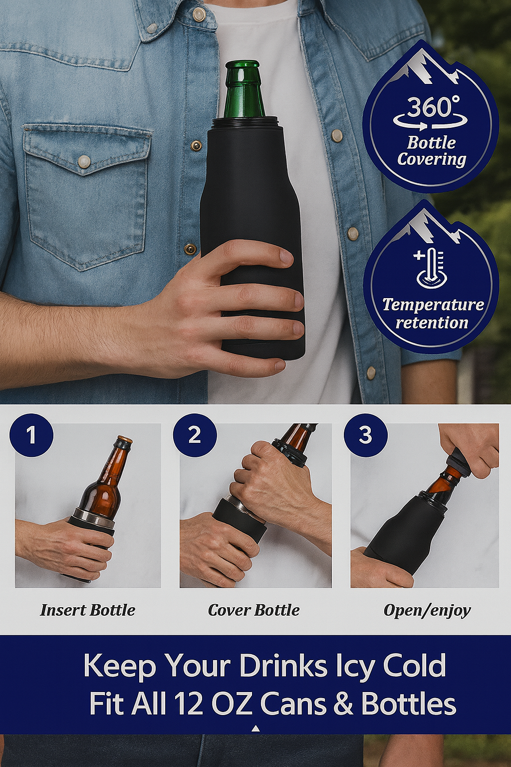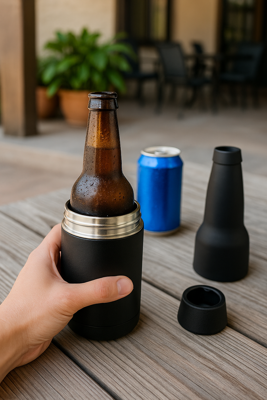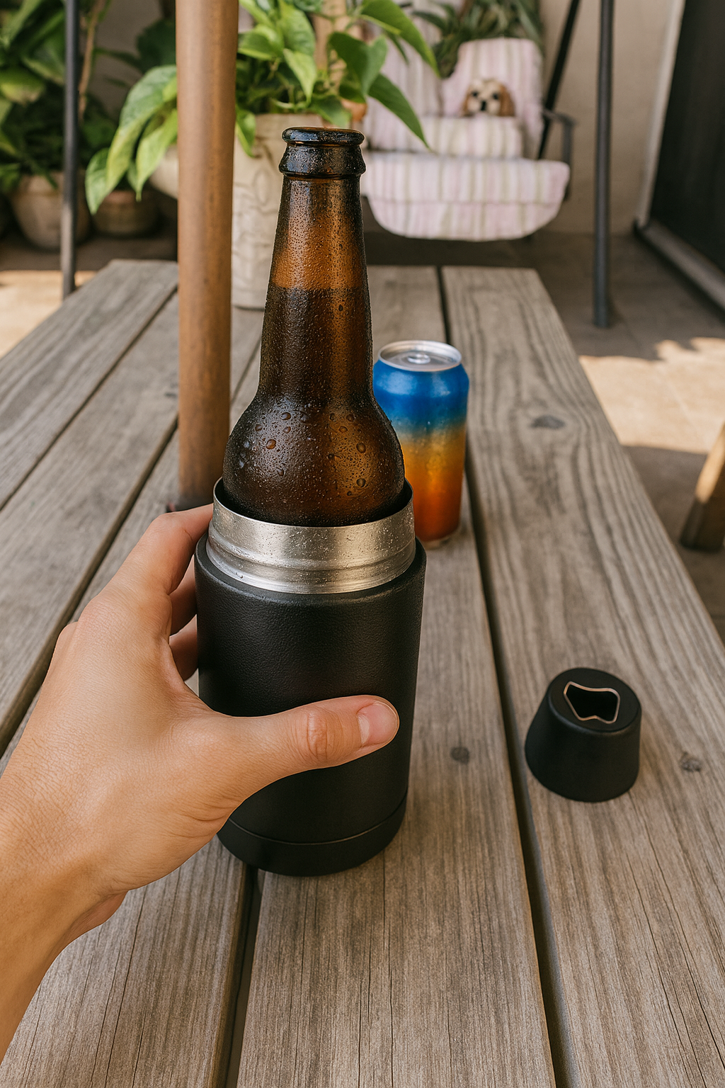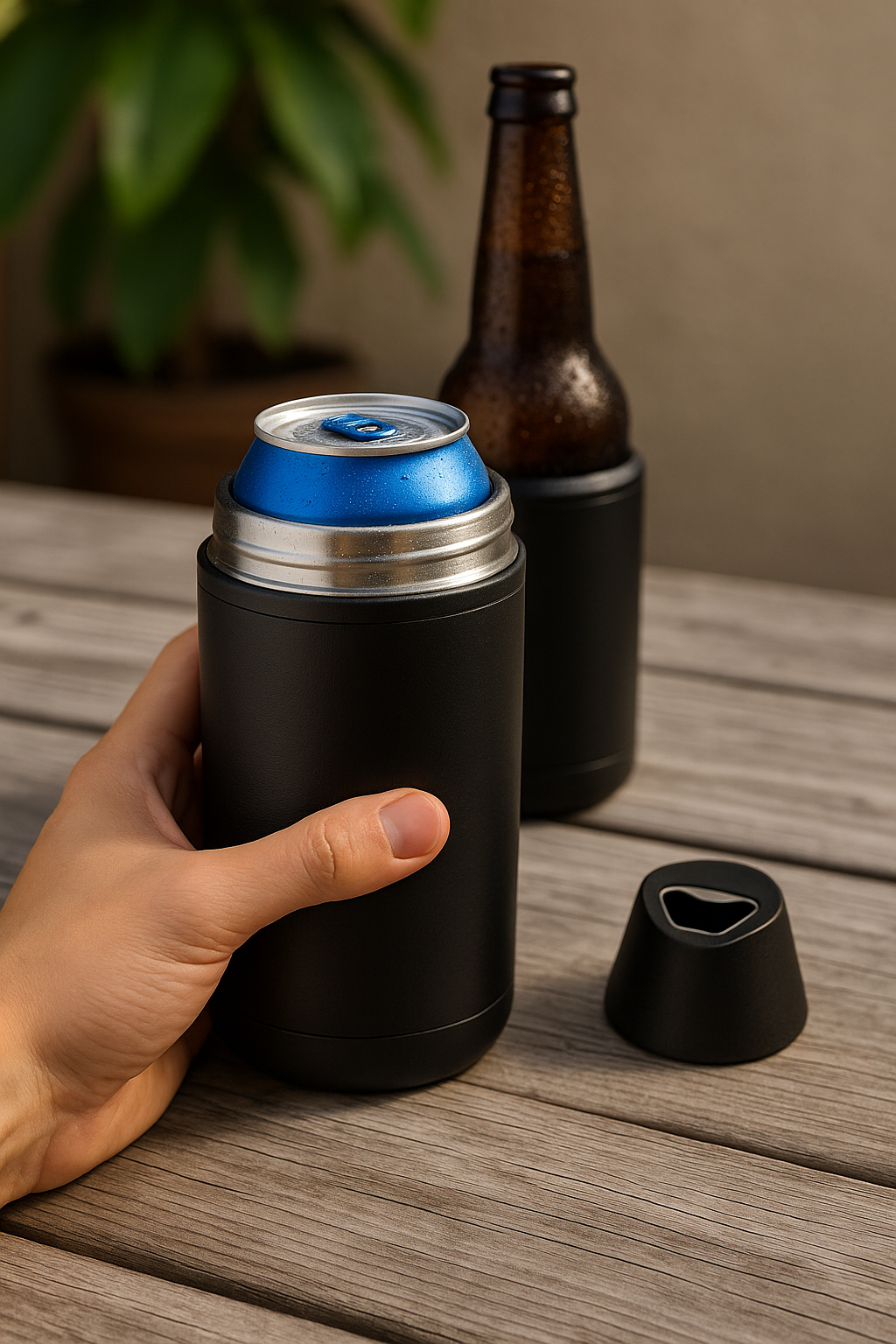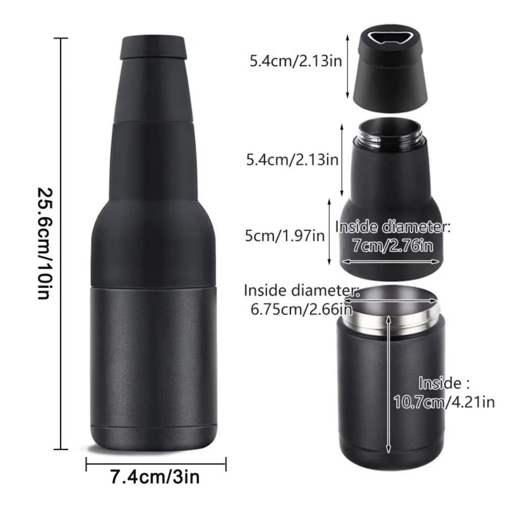This double-walled can and bottle holder is the perfect solution for keeping your beverages cold for longer. Made from high-quality stainless steel, it not only provides superior insulation but also protects your drink from bumps and drops.